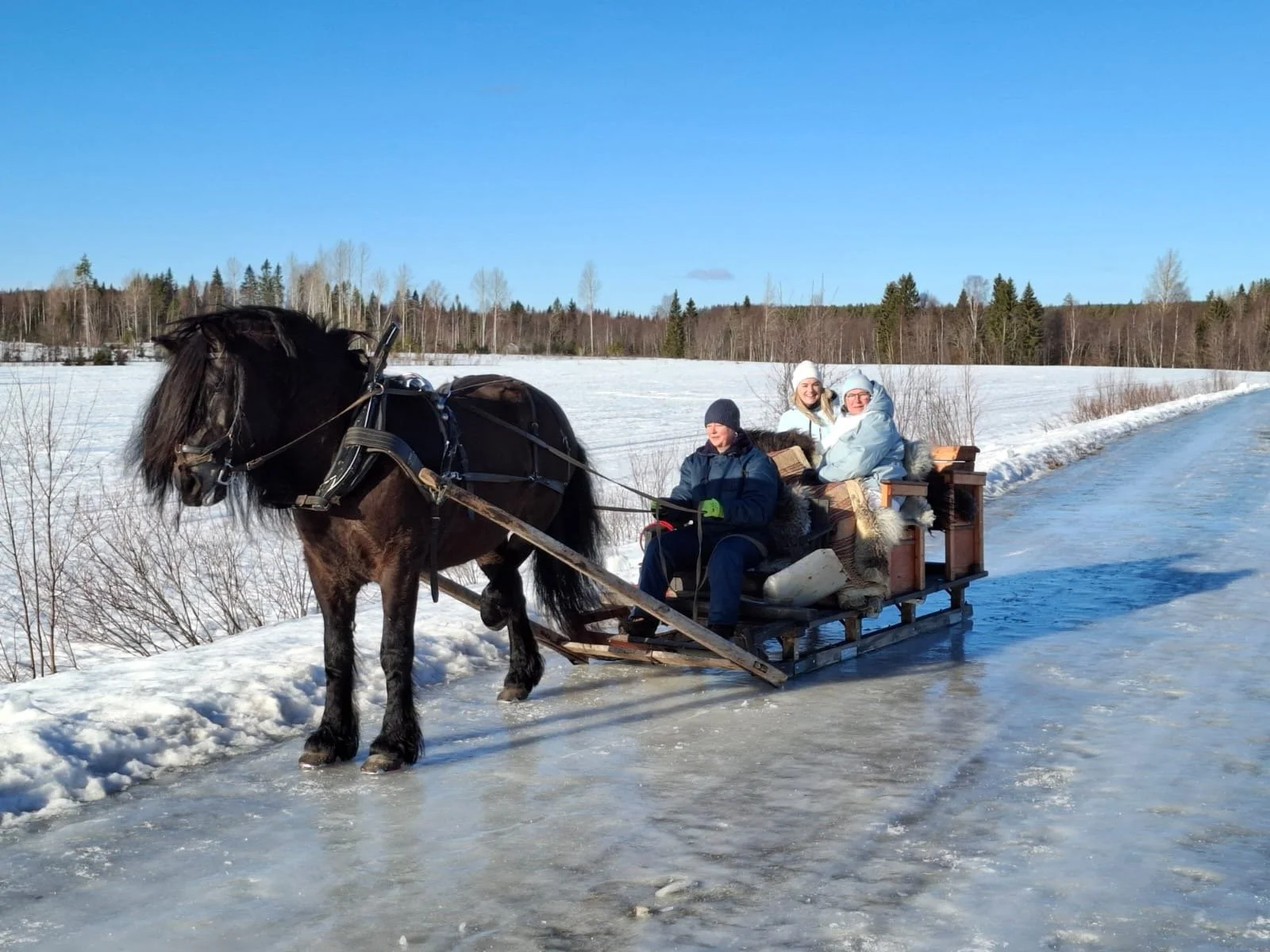 A thick blanket of snow, the white trees, sitting in a sleigh with a blanket, or actively standing on the sleigh while sliding through a winter wonderland. Contact us for more information or to book the activity.